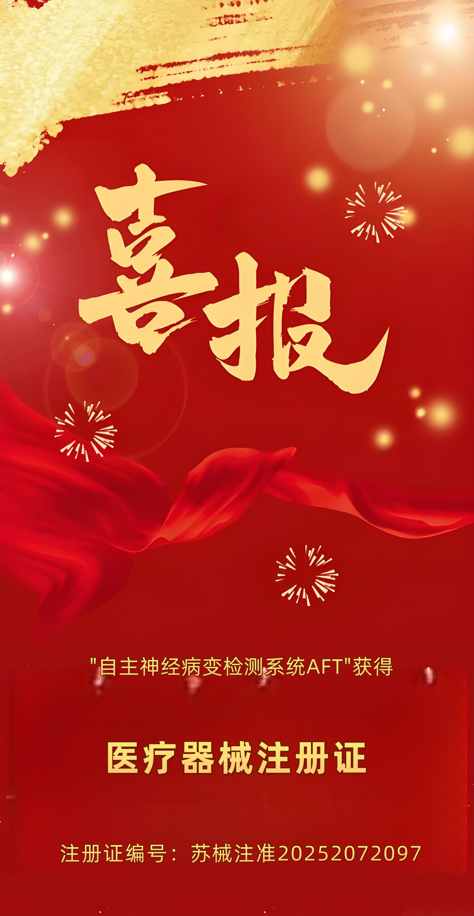 我司核心产品“自主神经病变检测系统AFT系列”成功取得医疗器械注册证!医疗器械注册证的获批是对产品安全性、有效性及质量可控性的官方认可,也是我司深耕医疗健康领域、践行品质承诺的里程碑时刻。